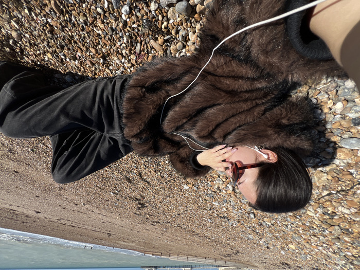 An individual is depicted lying on their back on a pebble beach in Worthing, United Kingdom, oriented with their head towards the left side of the frame. The person is wearing a dark brown faux fur hooded jacket, dark trousers, and brown-tinted sunglasses. White wired earbuds are inserted into their ears, with the cable visible across the jacket. The individual's right hand, with light pink polished fingernails, is positioned near their chin. The scene is illuminated by direct sunlight, casting shadows on the pebbles. In the background, the aqua-colored sea is visible, with Worthing Pier extending into the water.