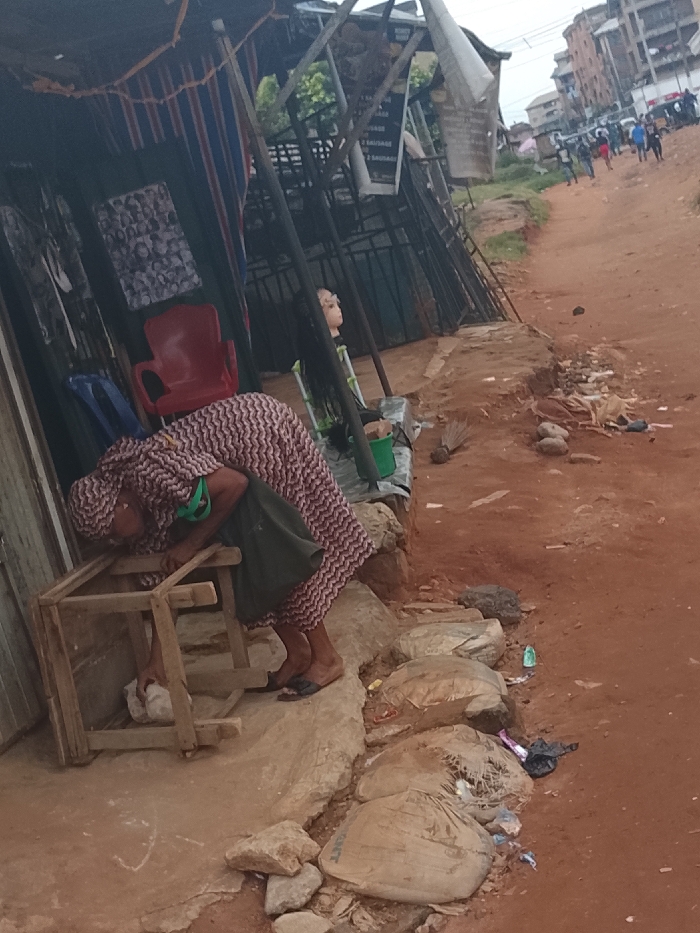 This image depicts a bustling, informal roadside scene within the city of Onitsha, Nigeria. The foreground features an individual, likely female, dressed in a patterned, reddish-brown and white long garment with a matching head covering and dark sandals. A green fabric, possibly a face mask, is visible around her neck. She is bent over a light-colored wooden frame or stool, with her right hand reaching under it towards a white object. To the left, part of a corrugated iron-roofed structure with vertical striped fabric walls (blue and red) is visible, likely a shop or stall. Inside this stall, a red plastic armchair is present, and further back, a blonde mannequin head with drawn eyebrows and long dark hair extensions is perched on a stand, suggesting a beauty or hair business. A green bucket sits on the ground near the mannequin. Faint signage in the background advertises "SAUSAGE." The scene unfolds along a rough, elevated concrete or stone ledge that borders a wide, reddish-brown dirt road. Several large, beige sacks, possibly filled with cement or sand, are arranged along this ledge. Scattered litter, including plastic bottles and wrappers, is visible on the ground beside the sacks and on the dirt road itself, along with a small, natural fiber broom. In the middle ground, the dirt road extends into the distance, with several pedestrians visible, and multi-story buildings line the horizon under an overcast sky. Sparse vegetation is present between the stalls and the background structures.