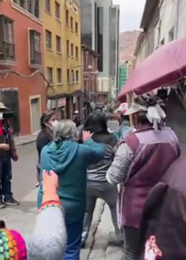 street scene with a group of people, seemingly in a dispute or protest. The video is shot in a narrow street, with tall buildings on either side. Several people are visibly pushing and shoving each other, with raised voices and what appears to be an attempt to physically move someone. Several people are wearing face masks. One person is carrying a pole or stick. Others seem to be bystanders or trying to de-escalate the situation. The street has a bustling, urban feel with vendors present. The overall atmosphere is tense and confrontational. The chant "fuera" (out) is being repeated.