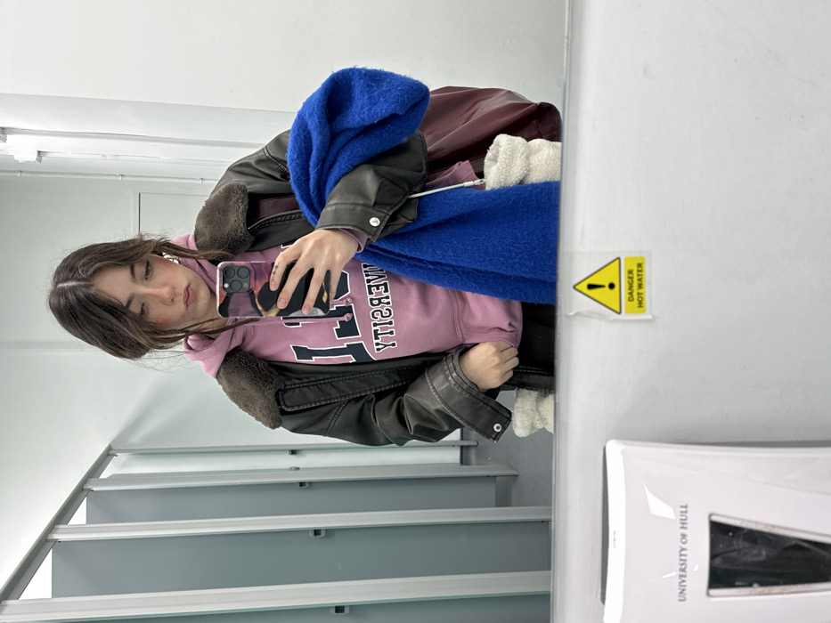 An interior scene captured as a mirror selfie depicts a young female within a University of Hull facility in Hull, United Kingdom, specifically a washroom or changing area