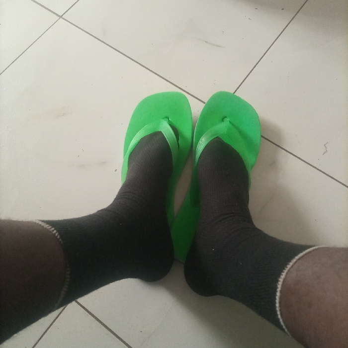 The image depicts a close-up, downward view of two lower legs and feet, located in Kimorori/Wempa ward, Kenya. The individual's feet are clad in black ankle-height socks, each featuring a white band at the top cuff. Over these socks, a pair of bright green flip-flops are worn, positioned on a light-colored tiled floor. The floor tiles are square or rectangular with visible dark grey grout lines, indicating an indoor setting. Minor surface debris or scuff marks are present on the tile surface. No other individuals or distinguishing features of the wider environment are visible.