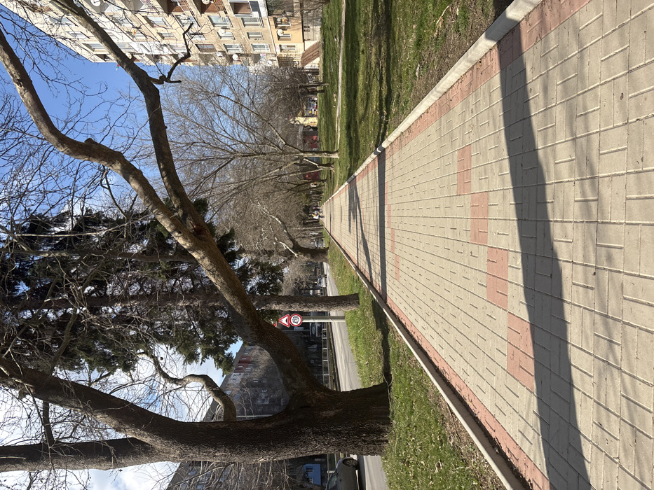 The image depicts a roadside scene in Pernik, Bulgaria, under clear skies. A long, straight pedestrian sidewalk, paved with light-colored rectangular blocks interspersed with reddish-brown blocks in patterns, extends from the foreground into the distance. Concrete curbs delineate both sides of the sidewalk. To the immediate left of the sidewalk is a strip of green grass, followed by a two-lane asphalt road. Vehicles are present on the road; one light-colored car is partially visible on the far left, moving away from the viewer. A red triangular warning sign with a white circle indicating "80" in black is mounted on a pole adjacent to the road. Large, bare-branched deciduous trees, along with some taller evergreen conifers, line the road and extend into the upper left of the frame. On the far left, multi-story residential buildings with multiple windows and balconies are visible behind the trees and road. To the right of the sidewalk, a wide expanse of green grass is present, populated by numerous bare-branched deciduous trees creating an informal treeline. Several individuals are visible walking on the sidewalk in the mid-ground, appearing as small figures due to perspective. In the background on the right, a large, multi-story apartment building with light-colored facades and numerous balconies is prominent. The sky overhead is clear blue with some scattered white clouds. The lighting indicates direct sunlight, casting distinct shadows from trees across the sidewalk.