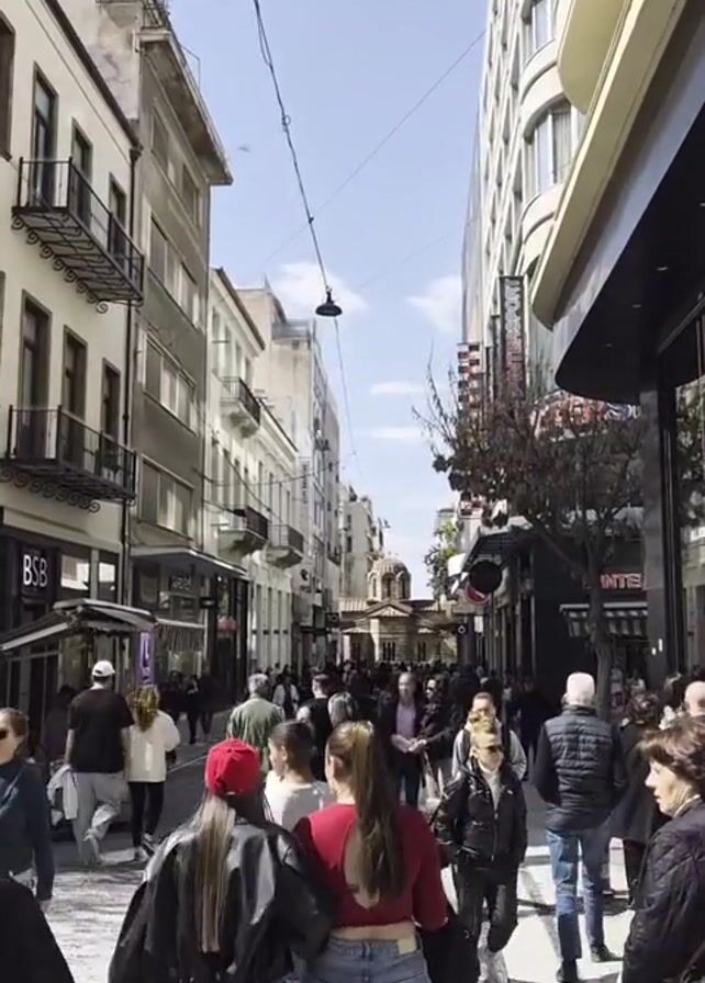 street in Athens, Greece filled with people. Buildings line both sides of the street, with a mix of shops and apartments visible. Many people are walking, mostly in the direction of the camera's view. The sky is blue, and a few street lights are suspended above the street. A small, domed building can be seen at the end of the street. The overall atmosphere suggests a busy and sunny day in the city.