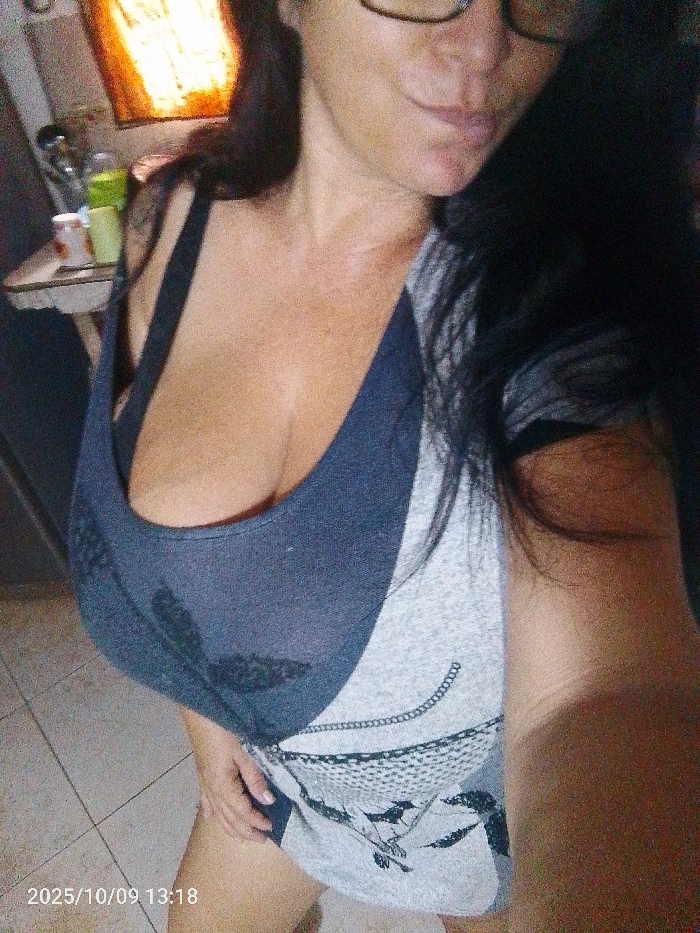 The image displays a partial view of a female subject, from mid-torso upward, engaged in taking a self-photograph indoors, in the city of Unknown, Unknown. The subject has long dark hair, wears dark-framed glasses, and is dressed in a dark blue bra under a light grey and dark blue two-tone top with a graphic design. A dark, possibly wet, irregular area is visible on the lower blue section of her top. The subject's right hand is partially visible near her right hip. The background shows an interior space with a light-colored tiled floor. To the left, a countertop or shelf is visible, holding two green containers, a white cup with a red design, and another light-colored container. Behind the countertop, a window with an orange-hued curtain or light source is present. A digital timestamp "2025/10/09 13:18" is affixed to the lower left corner of the image.