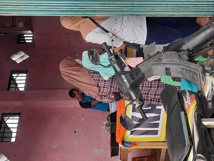 A storefront is partially closed with a man in a blue shirt and tan hijab standing inside. Another person wearing a white shirt and tan hijab is also inside the shop. The interior is painted pink, and barred windows are visible. A disassembled motorcycle occupies much of the foreground, including its handlebars, seat, and fairing. A yellow sign and various other items are scattered on a table near the motorcycle parts.