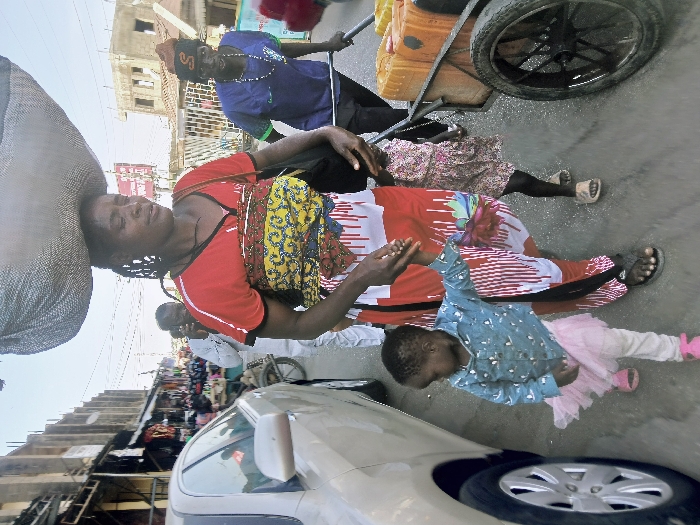 The image depicts a bustling street scene in Kwekwe, Zimbabwe. A dark-skinned woman, appearing to be in her 30s-40s, is centrally positioned, walking forward. She wears a red short-sleeved top with a multi-patterned section (yellow, red, white, blue) and a red-and-white striped skirt or wrap. She balances a large, light-grey fabric sack on her head with no visible support from her hands. Her right hand grasps the left hand of a small child to her left. This child, possibly a girl, wears a light blue long-sleeved shirt with a white pattern, white leggings, and a pink ruffled tutu skirt, with pink open-toed shoes. Another smaller child, also appearing to be a girl, is positioned to the central woman's right, wearing a floral or patterned dress and light-colored sandals. To the right of these individuals, a dark-skinned man in a blue shirt, dark pants, and an orange/brown beanie with a black 'S' logo pushes a two-wheeled metal cart. The cart holds at least three orange jerrycans or similar plastic containers. In the mid-background to the left, partially obscured by the central woman, a dark-skinned man in a white shirt appears to be holding a phone to his right ear. On the far left, a light-gold/beige sedan is parked or moving slowly, with its front bumper and wheel visible. The street surface is grey asphalt. The background features various buildings, including market stalls or shops with goods displayed along the left side of the street, and multi-story structures further back. The sky is bright and clear, indicating daylight.