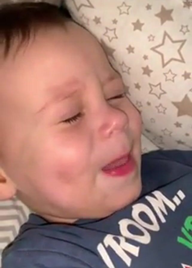 A close-up shot shows a young child lying down with their eyes closed and mouth open, appearing to be crying or whimpering