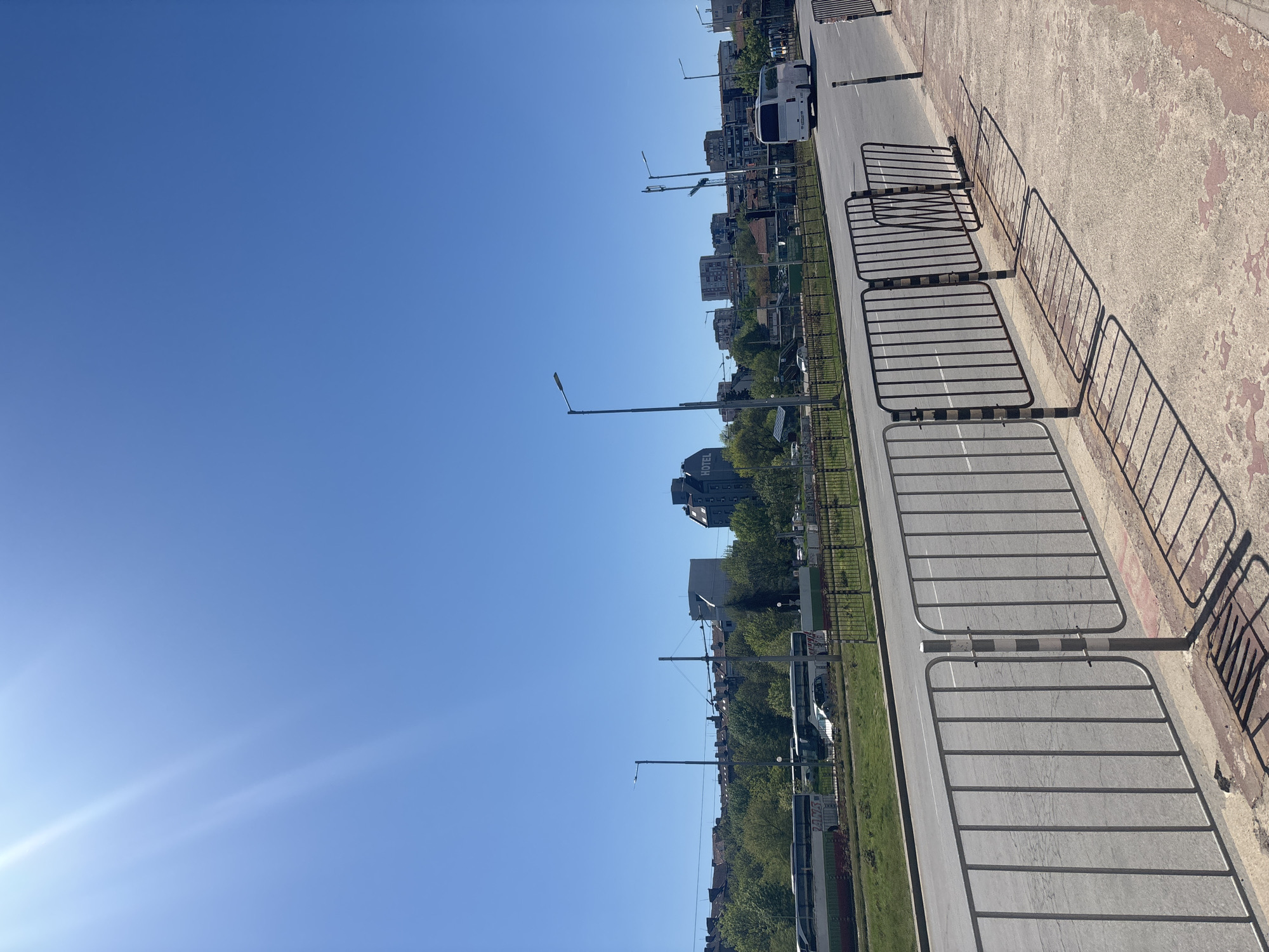 The image captures a street scene in Sofia, Bulgaria on a clear, sunny day. A row of metal pedestrian barriers, painted with black and white stripes, stands along the edge of a sidewalk. A gray asphalt road runs parallel to the sidewalk and barriers, with a grassy median separating it from a row of buildings. The buildings vary in height and architectural style, with trees lining the street. In the distance, a van is parked on the side of the road. The sky is a clear blue, with a hint of sunlight in the lower left corner.