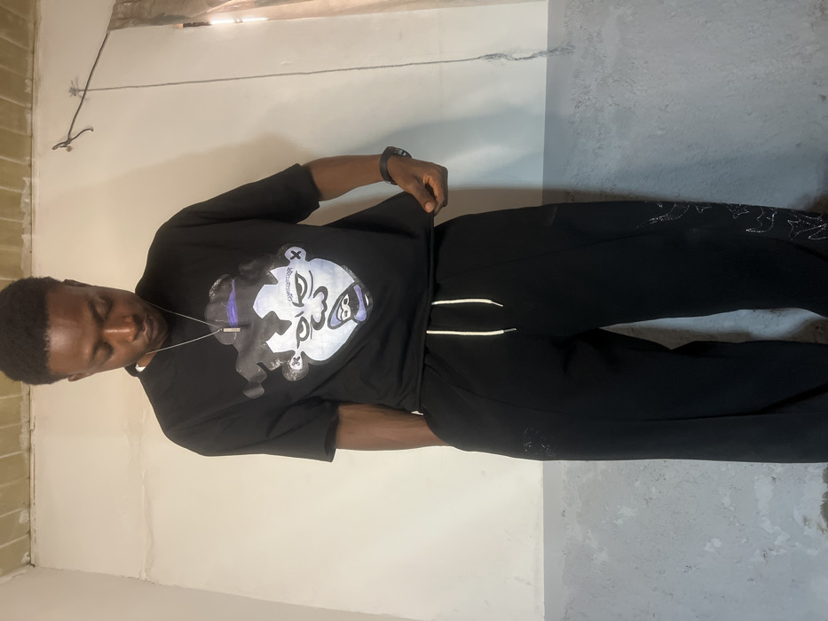 The image depicts a male individual standing indoors in Kirana, Nigeria. He is positioned facing forward, with his head slightly bowed and gaze directed downwards. The individual has short, dark hair and is wearing a black short-sleeved t-shirt featuring a large, stylized graphic of a light-colored, expressive face with dark features and a purple-tinged hat or head covering. He wears a silver-colored chain with a rectangular pendant around his neck. His left hand is placed in the pocket of his black pants, which have a white drawstring visible at the waist. His right hand is pulling on the bottom hem of his t-shirt. A dark-colored wristband or watch is present on his left wrist. The black pants exhibit reflective or shiny patterns, resembling abstract flames, along the outer seam of the left leg. The background consists of a wall painted in two horizontal sections: an upper off-white section and a lower faded grey section, with a visible seam between them. The wall shows minor signs of wear and discoloration. A thin, dark, wire-like fixture is visible on the upper right portion of the wall, and a light-colored structural beam is at the top edge of the frame.