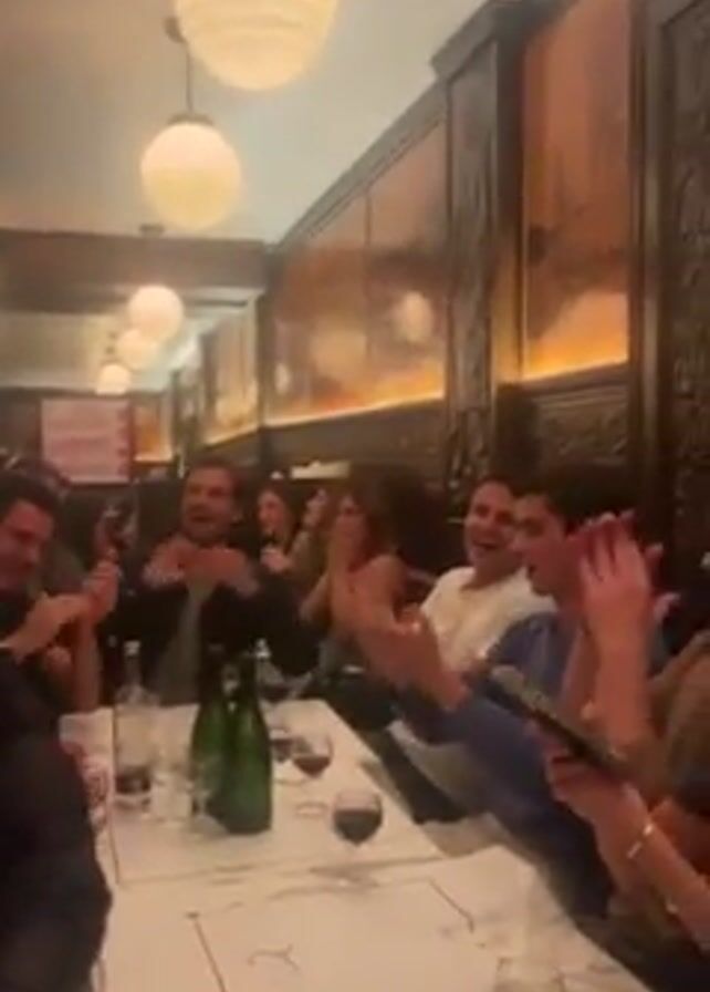A group of about ten young adults celebrate while seated at a long, white-clothed table in an elegant restaurant. They clap and cheer, several holding up phones to record. Bottles of wine and filled wine glasses sit on the table. A server approaches with a tray bearing a small object, likely a celebratory dessert or small treat, presented for the occasion. The restaurant features ornate dark wood paneling, decorative artwork, and globe-shaped light fixtures overhead. The atmosphere is lively and joyous.
