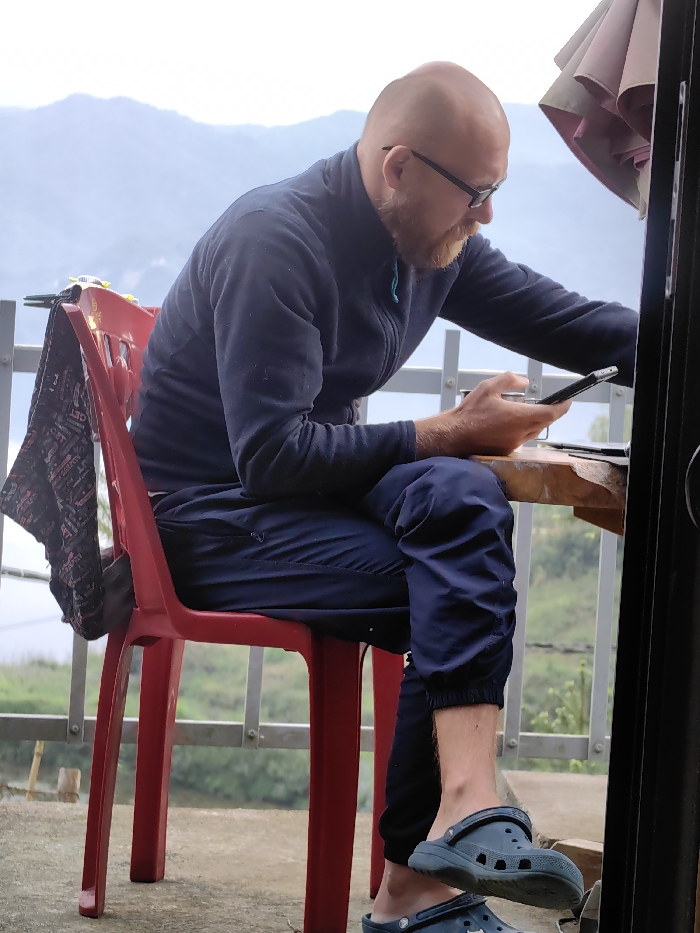 A Caucasian male with a bald head, dark stubble beard, and black-rimmed glasses is seated on a red plastic chair on an outdoor balcony in Tả Van, Vietnam