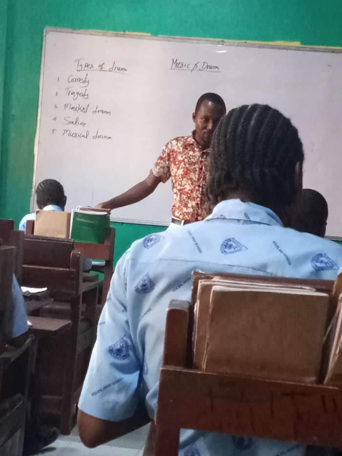 A teacher in a patterned shirt stands in front of a whiteboard in a classroom. The whiteboard lists "Types of Drama" as: Comedy, Tragedy, Masked drama, Satire, and Musical drama, alongside the heading "Music & Drum." Students in blue school uniforms sit at wooden desks, facing the teacher. The uniform shirt bears the inscription "SOKEM HIGH SCHOOL." Some students have books on their desks.
