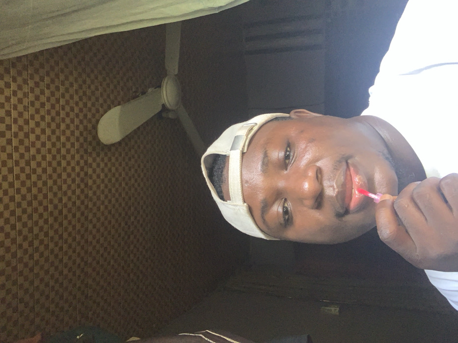 An individual is depicted indoors in Akwanga, Nigeria. The subject is a male, wearing a light-colored baseball cap backward and a white t-shirt. He is shown applying a red, glossy substance to his lower lip using a clear lip gloss applicator. His gaze is directed forward, towards the camera. The background features a ceiling covered with brown and beige checkered acoustic tiles, from which a light-colored ceiling fan with three visible blades is suspended. To the right of the subject, a light-colored, possibly sheer, curtain is partially visible. A darker, vertical structure is present on the left side of the frame.