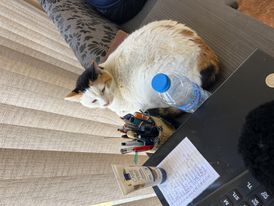 The scene depicts an indoor environment in Lovech, Bulgaria. A calico cat, with white, black, and orange fur patches, is positioned on a brown surface in the central-right of the frame. The cat faces left with its eyes partially closed, and its tail, predominantly black, curls behind it. On the brown surface, a black laptop keyboard with a visible "TR" key is partially visible at the bottom left. Next to the keyboard, a handwritten numbered list in Cyrillic script is present on a piece of white paper. Adjacent to the paper, a 75 ml tube of "AVON CARE Jojoba Oil & Shea Soothing Hand Cream" stands upright. Behind these items, a woven container holds multiple pens, pencils, and a pair of small scissors. Between the pen holder and the cat, a clear plastic bottle of "Devin" mineral water, with a blue cap and a "Bulbank" logo on its label, is visible. A 1 Euro coin rests on the brown surface at the bottom right. A black, textured object covers a portion of the laptop keyboard. The background features beige vertical window blinds. To the upper right, a grey upholstered surface with a dark floral pattern is discernible.