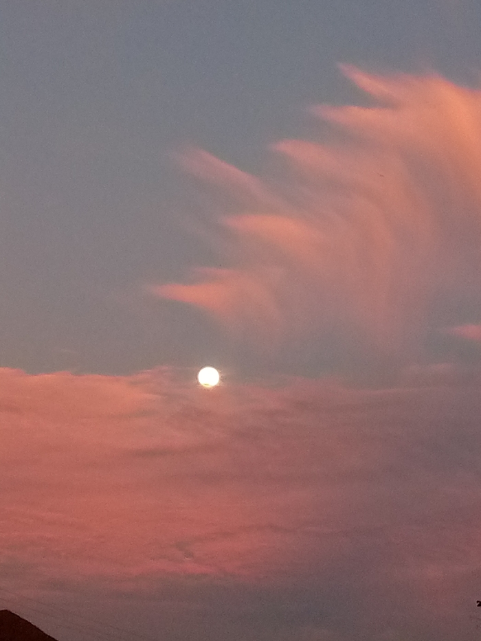 The image presents a sky scene over El Dátil, Venezuela, during a twilight period. The upper sky is light blue-grey, transitioning to extensive pink and orange cloud formations across the mid and lower frame. A luminous, circular, white-yellow celestial orb, consistent with the moon, is centered slightly left of the vertical axis, partially enveloped by pink clouds. Wispy, horizontally striated clouds appear in the upper right quadrant. The extreme lower-left corner shows an indistinct dark silhouette, likely a distant landform or structure. No individuals, animals, or specific anthropogenic objects or actions are observable within the frame.