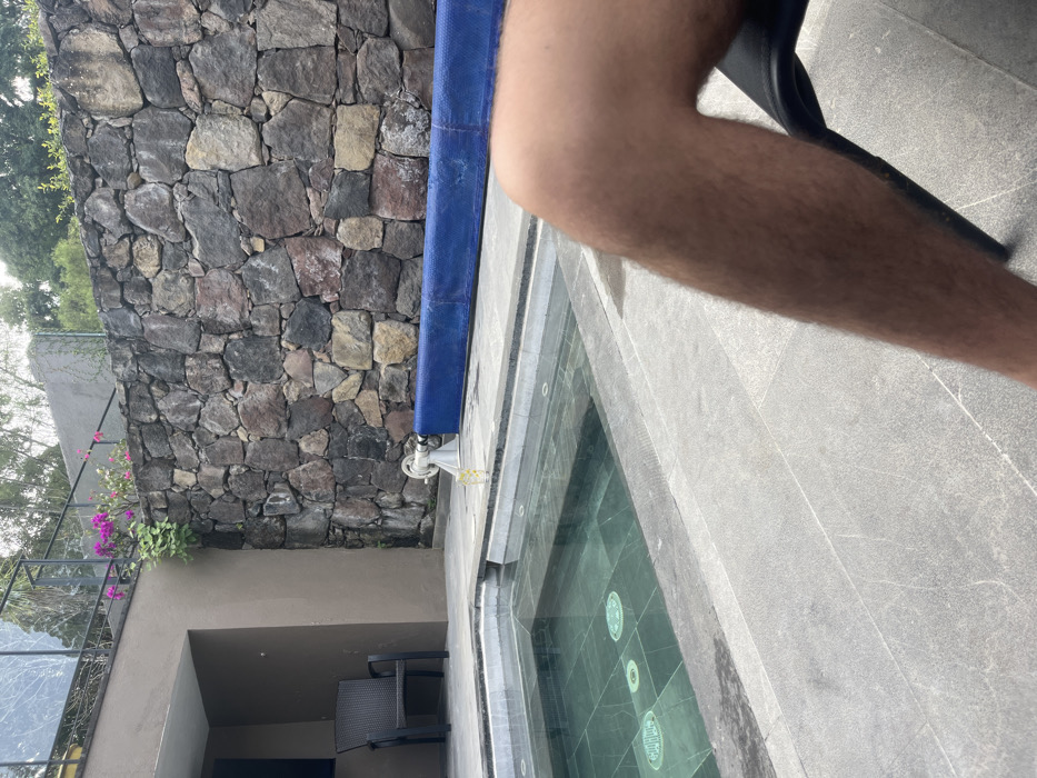 A man's leg is positioned at the top right of the frame, partially obscuring a pool with green tiled circular accents