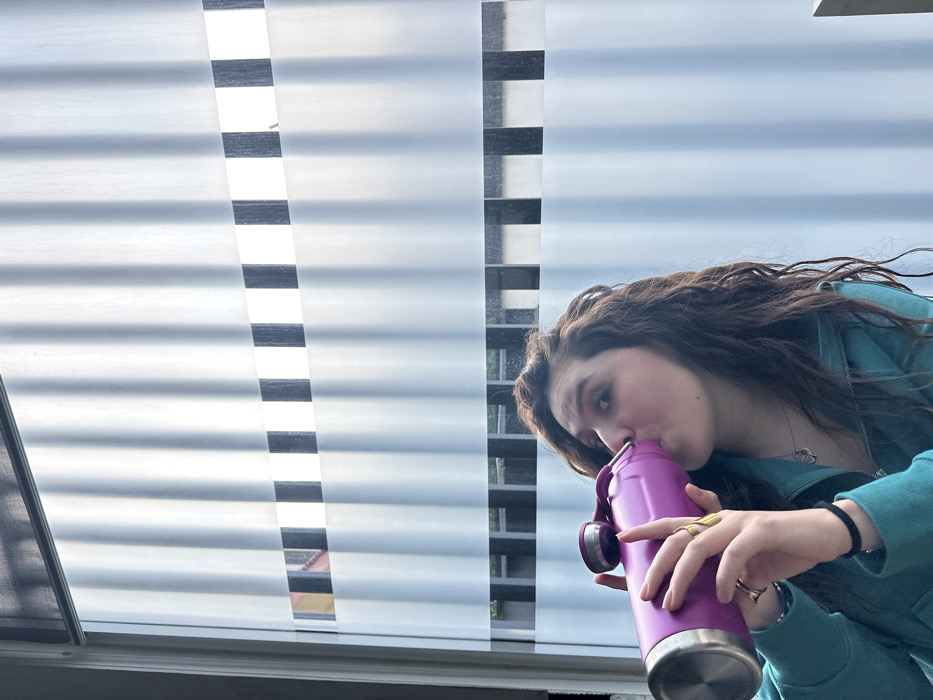 A young woman with long, curly brown hair drinks from a purple water bottle. She wears a teal zip-up hoodie, a silver necklace, and multiple rings on her fingers. In the background, a window with layered blinds creates horizontal stripes of light and shadow. A glimpse of the outside can be seen through the blinds. The scene appears to be indoors during the day.