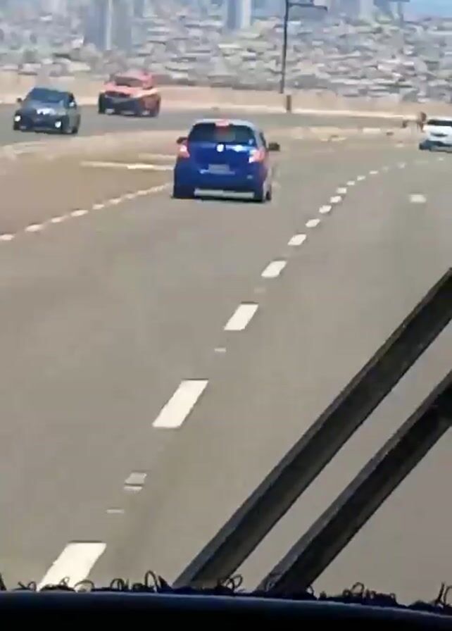 The video, taken from a vehicle with a partial view through the windshield, shows a road curving down towards a city in the distance by the coast. Several cars, including a blue hatchback with its brake lights illuminated, are moving on the road. The road has white dashed lane markings. The city skyline is visible in the background, along with the ocean. The day appears to be clear.