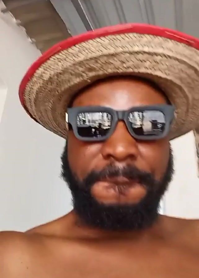 A shirtless man with a beard wearing a straw hat with a red rim and sunglasses stares directly at the camera. He points his right index finger at his chest. The background includes a white wall and a corrugated metal ceiling. Music can be heard.