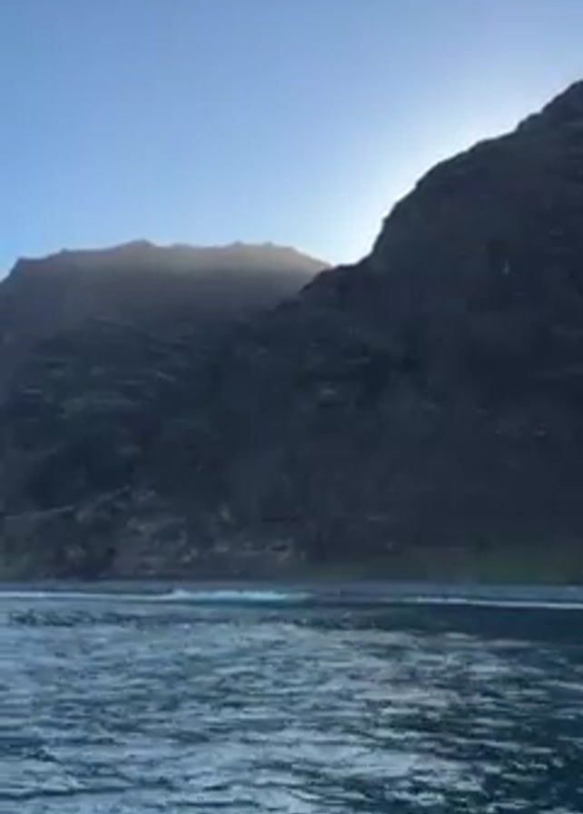 dramatic landscape, likely a coastline, dominated by a rugged, dark mountain range. The sun is positioned high behind the mountains, creating a backlighting effect that highlights the rough texture and contours of the peaks. The water in the foreground is a deep blue, suggesting a clear, deep body of water. Small waves lap at the shoreline, indicating a gentle sea. The sky is a clear, pale blue, suggesting a serene, possibly early morning or late afternoon setting.