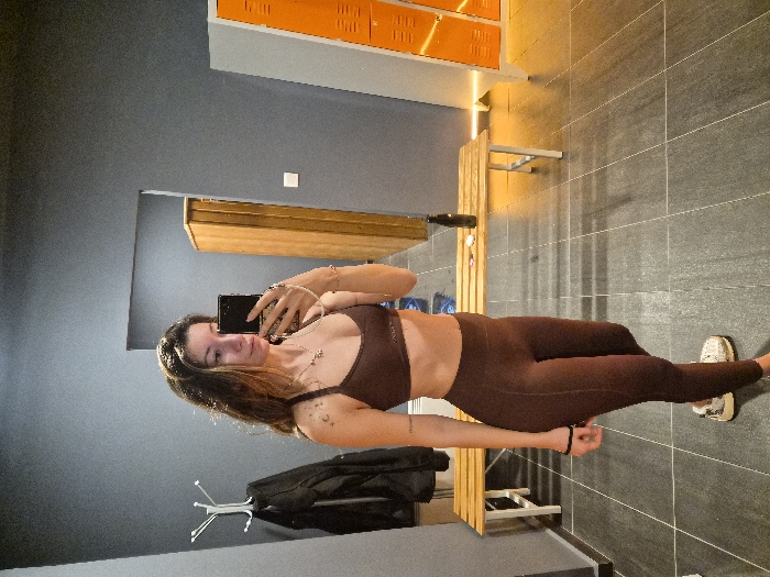 A young adult female is captured taking a mirror selfie in what appears to be a gym changing room or locker area located in the Municipal Unit of Corinth, Greece. The subject, a Caucasian female with long brown hair, stands centrally, holding a dark-colored smartphone in her right hand towards her reflection. She is dressed in a matching dark brown athletic sports bra and high-waisted leggings, complemented by white and beige athletic shoes. Accessories include multiple rings on her right hand, a light-colored bracelet on her right wrist, a dark bracelet on her left wrist, and a necklace with star-shaped charms. A tattoo of crescent moons and stars is visible on her left shoulder/upper arm, and a small band tattoo is on her left forearm. The environment features dark gray walls and a tiled dark gray floor with light gray grout lines. To the subject's left, a white coat rack holds a dark jacket. A long wooden bench with white metal legs extends across the middle ground. On the bench, a dark water bottle and two small light-colored circular objects are visible. To the right of the bench, a bank of bright orange metal lockers with silver handles is present. A strip of warm, orange light illuminates the lower wall behind the bench on the right. A tall, narrow wooden cabinet or locker is reflected in the mirror behind the subject.