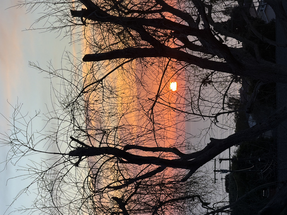A silhouetted tree with bare branches dominates the foreground against a vibrant sunset. Hues of orange, pink, and soft blue paint the sky. The sun appears as a bright disk peeking through the branches, casting a warm glow. In the lower right, a glimpse of a building and some poles are visible, indicating the presence of a nearby structure. The image captures a serene moment in nature, emphasizing the beauty of twilight.