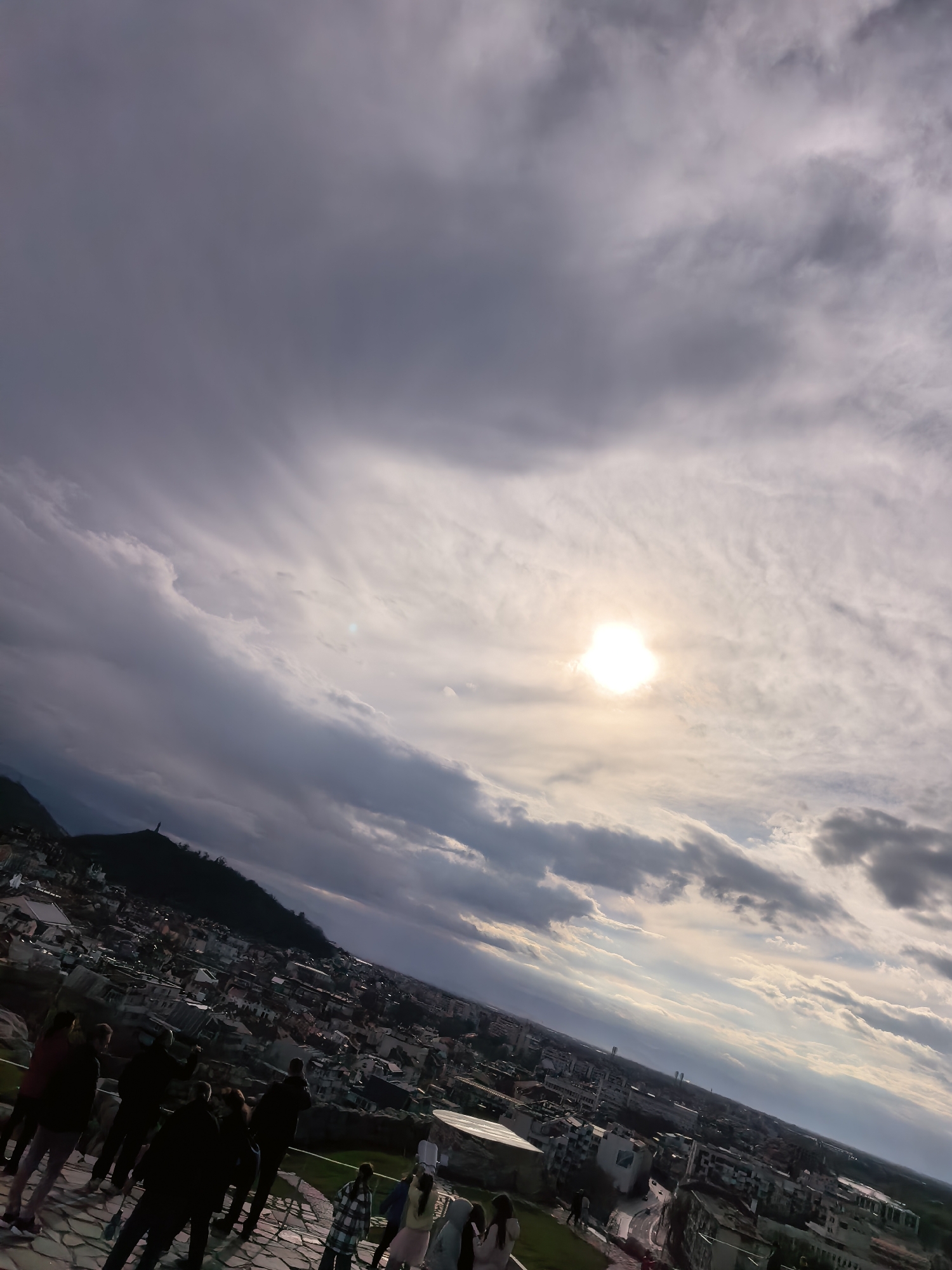 The image captures an elevated view over Plovdiv, Bulgaria, under a cloudy sky with the sun partially obscured