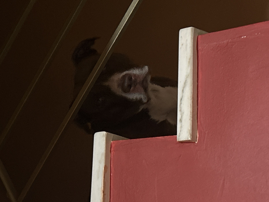 An image taken in Gerakas Municipal Unit, Greece, displays a dark-furred dog with prominent white markings on its muzzle and chest. The dog's head and upper torso are visible, positioned above a red-painted balustrade, which is topped with a white marble-like coping. The dog is looking directly towards the camera. Two parallel dark diagonal bars, consistent with a metal railing, are present in the upper portion of the frame, partially overlying the dog's forehead. The background behind the dog is uniformly dark and indistinct, indicative of a shadowed interior space.
