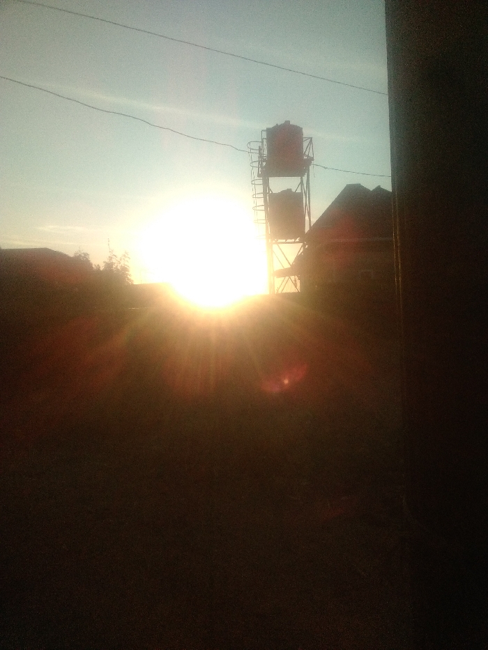 The sun bursts brightly behind a water tower with two tanks and a ladder, silhouetting nearby buildings and casting a glow across the landscape
