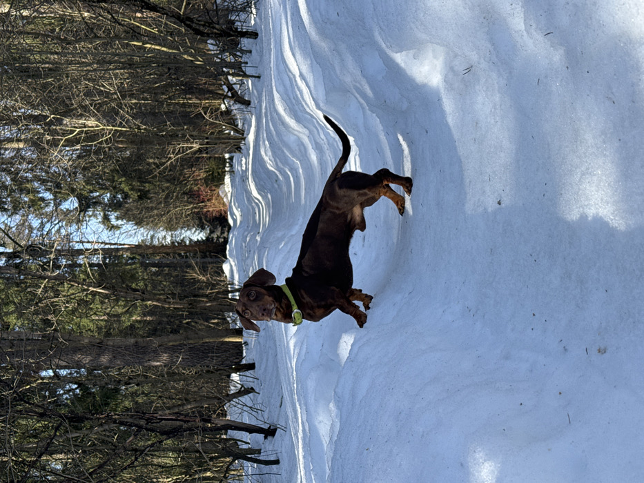 - "A dark brown Dachshund dog, wearing a lime green collar, stands on a snow-covered path in a forested area of Zelenogradskiy, Russia" by FM-xqHZp2, licensed under CC BY 4.0