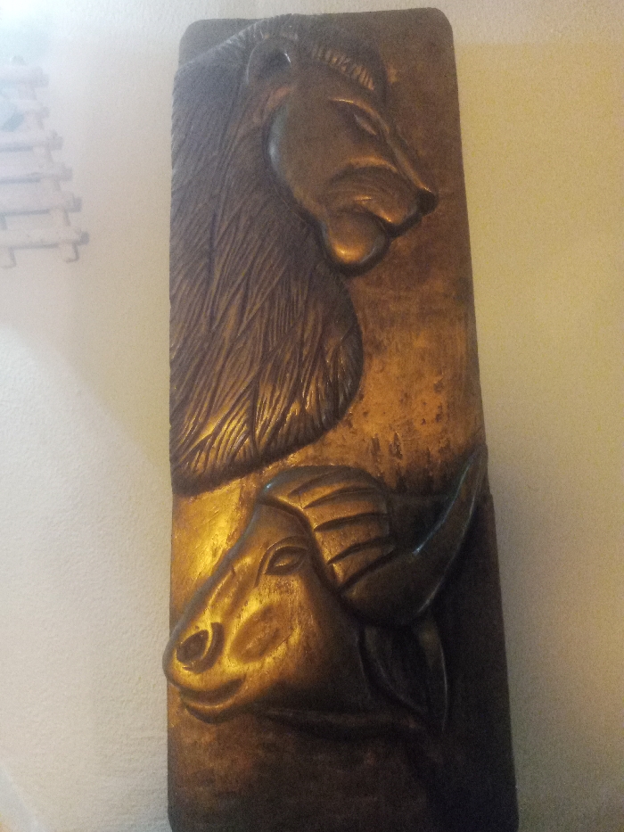 A vertical, rectangular carving depicts a lion's head above a ram's head