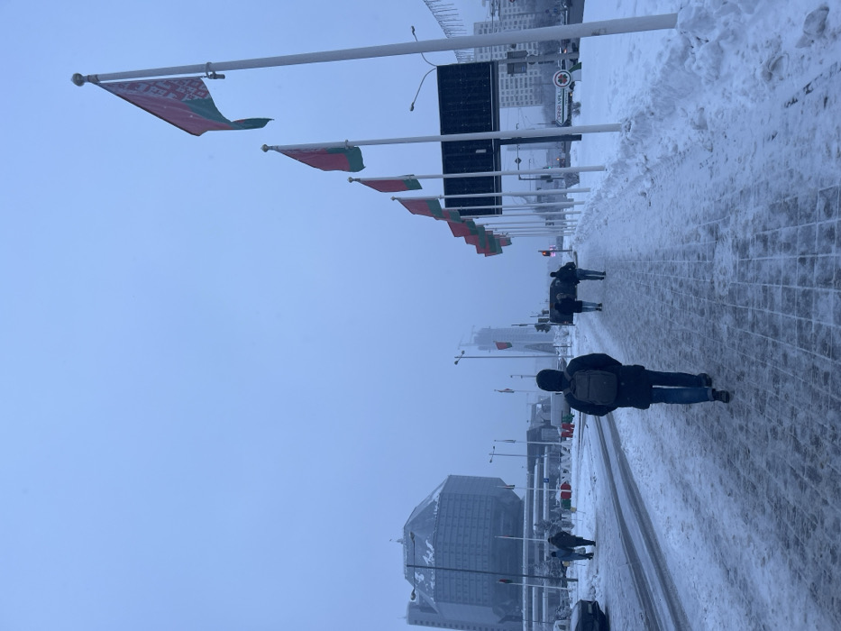 A row of Belarus flags adorns a snow-covered street. A person with a backpack walks along the walkway, and other figures are seen in the distance. Snow piles line the side of the path. A modern, geometric building stands in the background, obscured by the overcast sky. The scene depicts a cold, wintry day in Belarus.