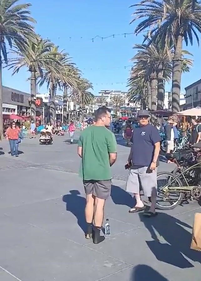 pedestrian area lined with palm trees and buildings on a sunny day. People are walking around and sitting on benches. There are several bicycles parked along the street, and an outdoor dining area is visible at one of the restaurants. Two men are standing and talking in the foreground, and one of them is holding a bottle of water.