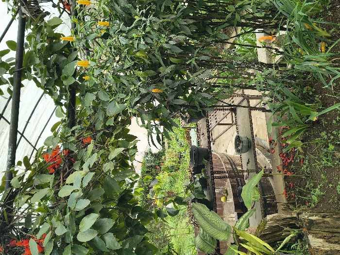 This image depicts a cultivated garden or nursery scene located in the city of Unknown, Vietnam. The foreground and midground feature dense vegetation under a translucent, possibly plastic, roof supported by dark metal beams. A climbing plant with numerous bright orange, trumpet-shaped flowers and green foliage drapes across the overhead structure on the left. To the right, a tall plant with prominent yellow, cone-like flowers and green leaves stands upright. In the midground, a two-tiered, rusty metal shelving unit holds several dark potted plants. Behind the shelving, a large, dark, cylindrical object, possibly a barrel or planter, is partially visible. A small, light green spherical fruit rests on the ground near this object. Scattered on the ground beneath the shelving are numerous fallen red-orange flower petals or similar organic debris. The ground consists of soil with various smaller green plants and sprouts. The background reveals an open grassy area with additional greenery and a light-colored building or wall in the distance. No people are visible, and no actions or interactions are depicted.