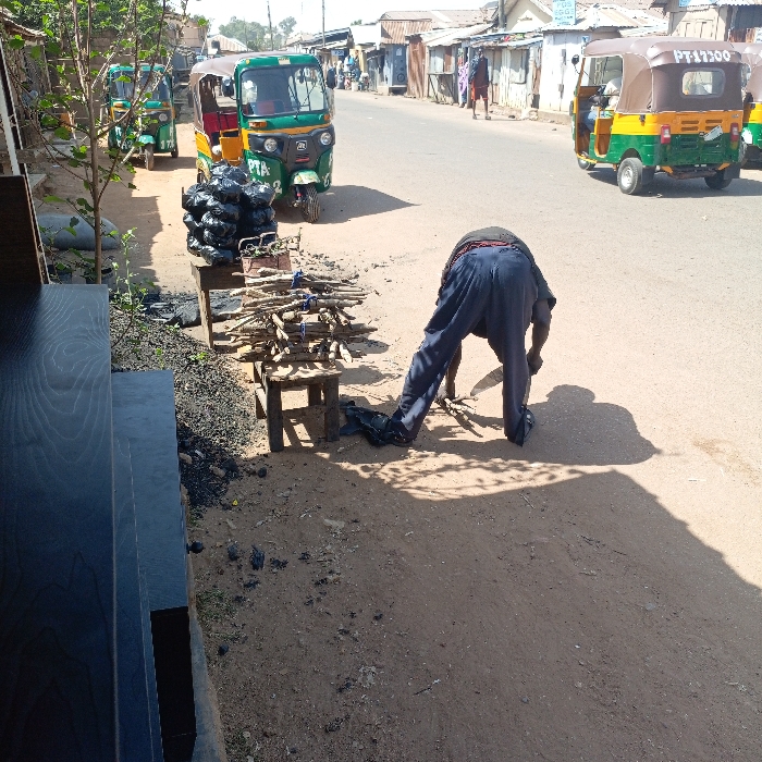 The image displays a sunlit street scene in Jos, Nigeria, featuring a combination of paved roadway and unpaved dirt shoulders. In the immediate foreground, a dark wooden surface occupies the lower left quadrant. On the unpaved ground to its right, a street vendor's stall is visible, consisting of two low wooden benches. These benches hold multiple bundles of cut sticks, likely firewood, tied with blue string, and a stack of black plastic bags, which appear to contain charcoal. Scattered dark debris, consistent with charcoal fragments, lies on the ground around the stall. A person, dressed in dark blue trousers and a dark shirt, is positioned centrally in the mid-ground, bent over at the waist with their back partially to the camera, actively engaged with the ground near the vendor's items. Their shadow is distinctly cast on the unpaved surface to their right. On the adjacent paved road, a green and yellow Keke Napep (motorized tricycle) with "PTA" visible on its front is parked near the vendor's setup. Further down the road, another green and yellow Keke Napep is visible, displaying the rear license plate "PT-17300". The background features a street lined with single-story buildings, many with corrugated metal roofs, and several pedestrians walking on the far side of the road. Sparse green foliage is present on the left side of the frame.