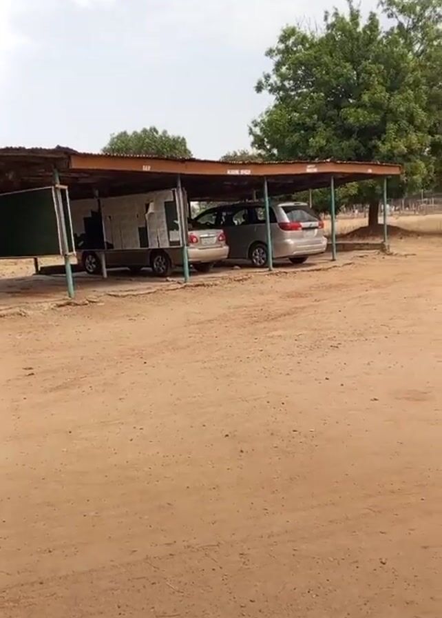 The camera pans across a flat, dusty, sand-colored landscape, passing by a simple carport structure with two vehicles parked underneath it, a low-lying building, and various trees