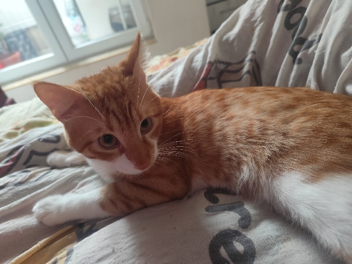 - "A domestic cat, an orange tabby with white facial markings, chest, belly, and paws, lies at rest on rumpled white and gray patterned bedding" by FM-yK57l1, licensed under CC BY 4.0