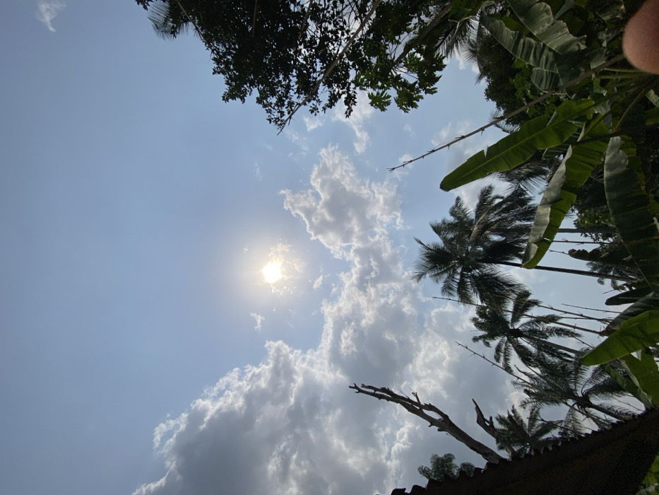The scene depicts an outdoor environment in Ikot Ete Ekpo, Nigeria, viewed from a low angle looking upwards towards the sky. The upper two-thirds of the image show a light blue sky with significant cloud cover. White cumulus clouds are scattered, appearing denser and more prominent on the left side of the frame, partially obscuring the sun. The sun is positioned slightly to the left of the upper center, appearing as a bright, radiating orb with visible rays, indicating strong daylight conditions. The lower third of the image is filled with various tropical vegetation. Several tall palm trees with dark silhouettes and visible fronds are present, predominantly in the lower-left and central portions. On the far left, multiple bare tree trunks, possibly dead or pruned, extend upwards. Large, broad green leaves, consistent with banana plants, occupy the lower-right foreground and extend towards the center. Additional dense green foliage from other trees is visible along the right edge of the frame. A dark, angular structure, likely a portion of a roof or building eave, is partially visible along the bottom-left edge. No individuals, animals, or specific actions are discernible within the frame.
