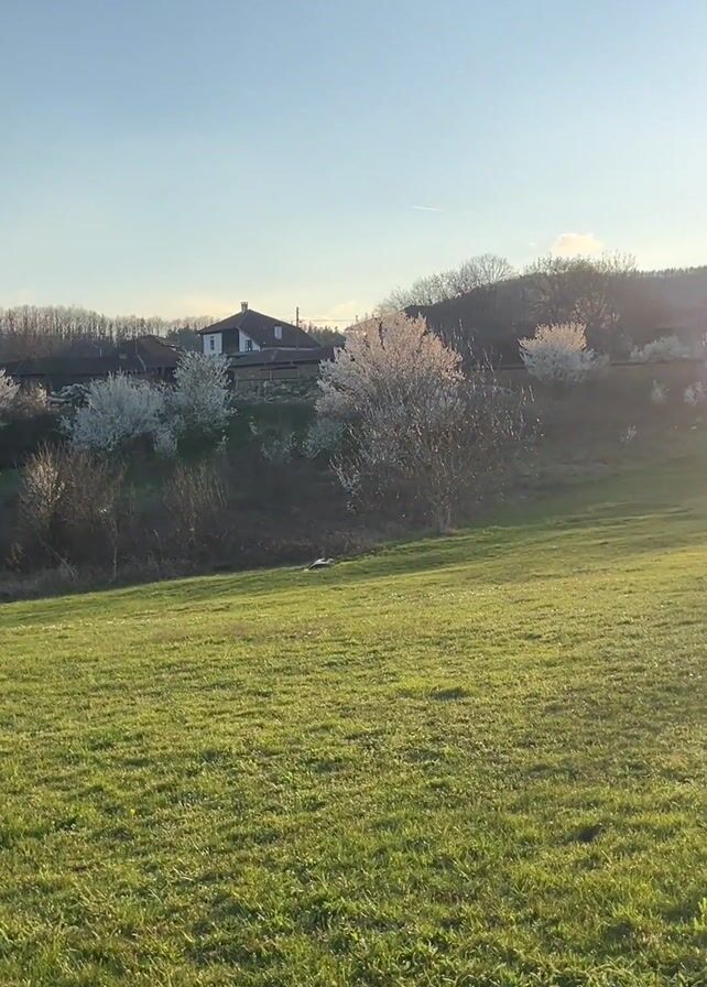bird, possibly a goose, in a grassy field. It flaps its wings and moves across the field. In the background are houses and trees, some of which are flowering. The sky is blue. The sun is shining, casting a glow on the scene.