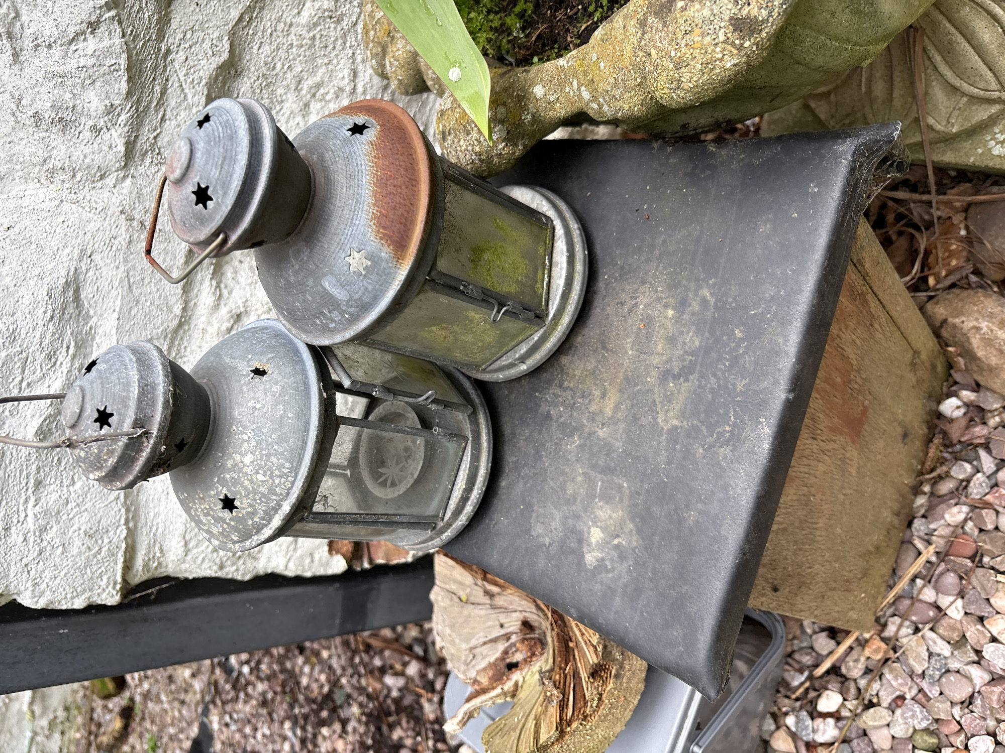 Two metal lanterns with star-shaped cutouts are stacked on a black plastic tray, which rests on a weathered wooden board and a piece of decaying wood