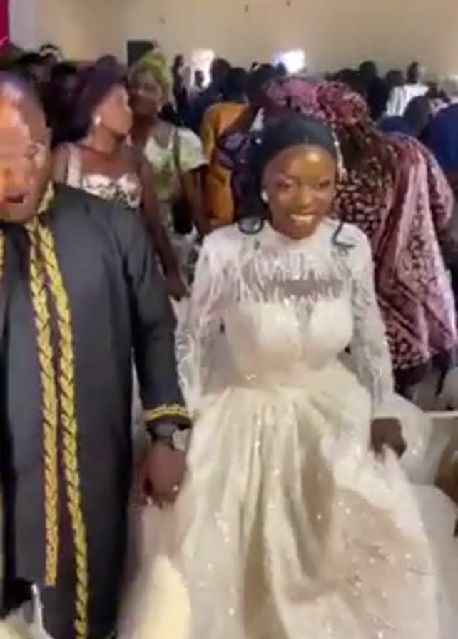 Here's a concise description of the video: Inside a crowded room, a newly married couple is dancing. The bride wears a long-sleeved white gown. The groom is dressed in a black tunic with gold trim. They hold hands while dancing, surrounded by wedding guests. The room appears to be a hall or large gathering space. The video is filmed from the perspective of someone nearby.