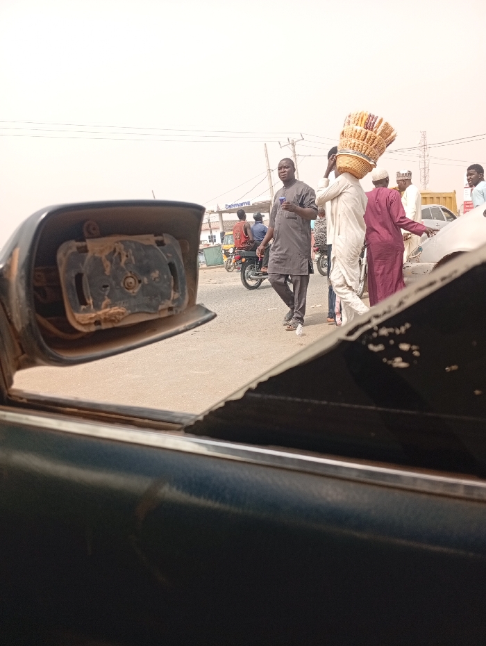 The image presents a street scene in Suleja, Niger State, Nigeria, observed from the interior of a dark-colored vehicle. The immediate foreground shows the vehicle's dark blue exterior, a partially visible side window frame, and a broken, dust-laden exterior rearview mirror housing lacking its mirror element. The midground features a paved road and several individuals. A man in a dark grey traditional tunic and trousers walks rightward, holding a blue object in his left hand. Adjacent to him, a vendor in a light-colored traditional garment and a white cap carries a large, woven basket on his head, containing multiple yellow and reddish-brown cylindrical items, consistent with roasted foodstuffs. Other individuals, including one in a maroon garment and another in white, are partially visible further right, appearing to be standing or walking. The background reveals a building with a blue sign displaying "Danmame," indicating a commercial establishment, likely a filling station. Utility poles and overhead power lines are visible. Several motorcycles and at least one light-colored truck are present on or beside the road. The sky is hazy and light-colored, and the environment appears dusty.