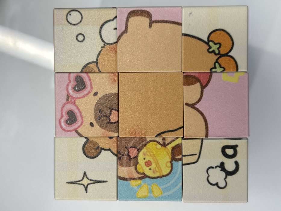The image displays a 3x3 grid composed of nine square, flat tiles arranged on a plain white surface. These tiles collectively form a partial cartoon illustration. The central figure is a brown, bear-like character with a light pink face, a wide, open-mouthed smile, and pink heart-shaped sunglasses. Specific details on the tiles include: - **Top Row:** The top-left tile shows a sparkling star symbol on a pale yellow background. The top-middle tile displays the upper portion of the bear's head and sunglasses. The top-right tile features two outlined circles, resembling bubbles, on a pale yellow background, with part of the bear's ear visible below. - **Middle Row:** The middle-left tile shows the bear's arm holding a yellow chick on a stick, set against a light blue background with radiating white lines. The middle-center tile is solid unadorned brown. The middle-right tile shows a curved brown line, part of the bear's body, on a pink and pale yellow background. - **Bottom Row:** The bottom-left tile shows the letters "ca" in black text alongside a small white cloud outline on a pale yellow background. The bottom-middle tile shows a pink garment, likely part of the bear's clothing. The bottom-right tile depicts two orange, round objects with short green stems, resembling small fruits or vegetables, on a pale yellow background. The scene is static, devoid of people, and features no discernible actions or interactions. The object is illuminated by bright, even lighting, suggesting an indoor setting. The image does not depict any specific geographic location within the city of Shumen, Bulgaria, but rather a close-up of a puzzle or block set.
