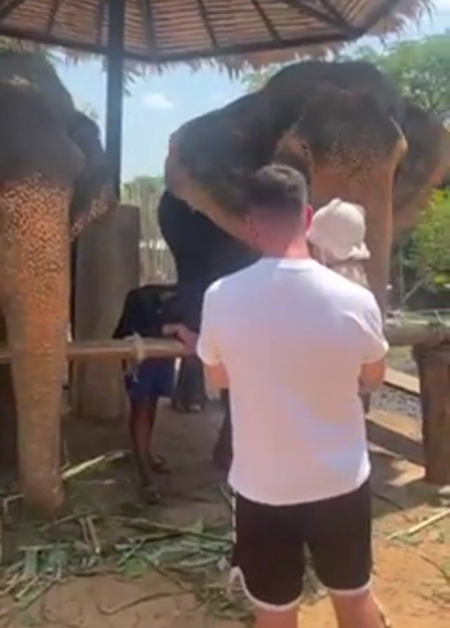 - "man in a white shirt and black shorts standing in front of two elephants that are behind a bamboo fence" by FM-Wibut2, licensed under CC BY 4.0