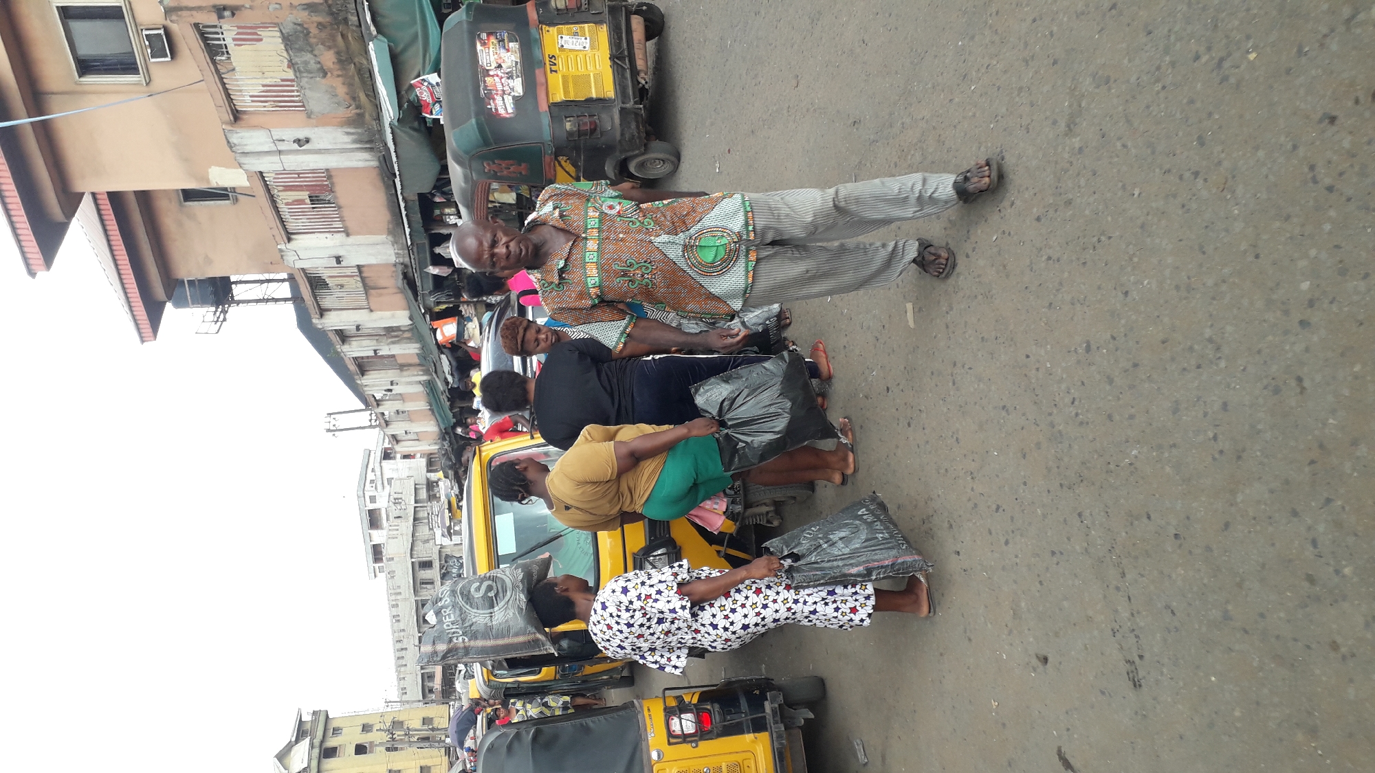 The image displays a bustling street scene in Onitsha, Nigeria, under an overcast sky