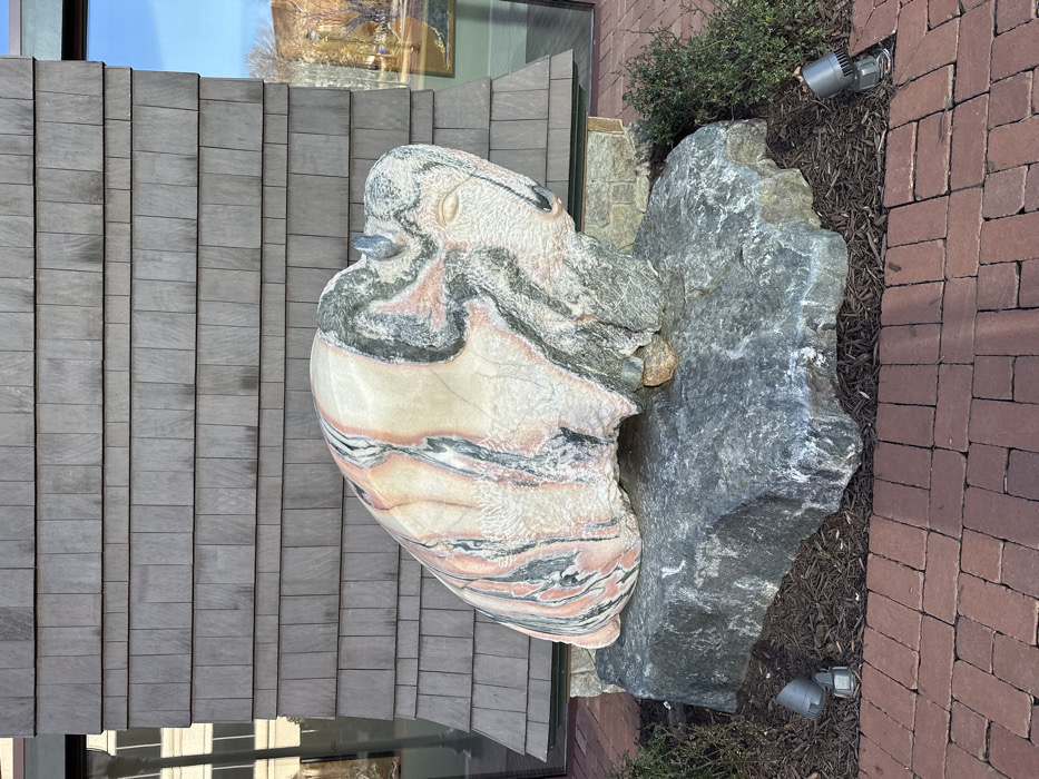 A stone sculpture resembling a bird sits beside a large gray rock. The bird sculpture is beige and pink, streaked with gray and black. The sculpture has a smooth, polished surface. A gray brick wall and pavers flank the sculpture. Landscaping mulch, greenery, and outdoor spotlights accent the surrounding area. The corner of a building with gray clapboard siding is visible in the background. A reflection is visible on the glass window.
