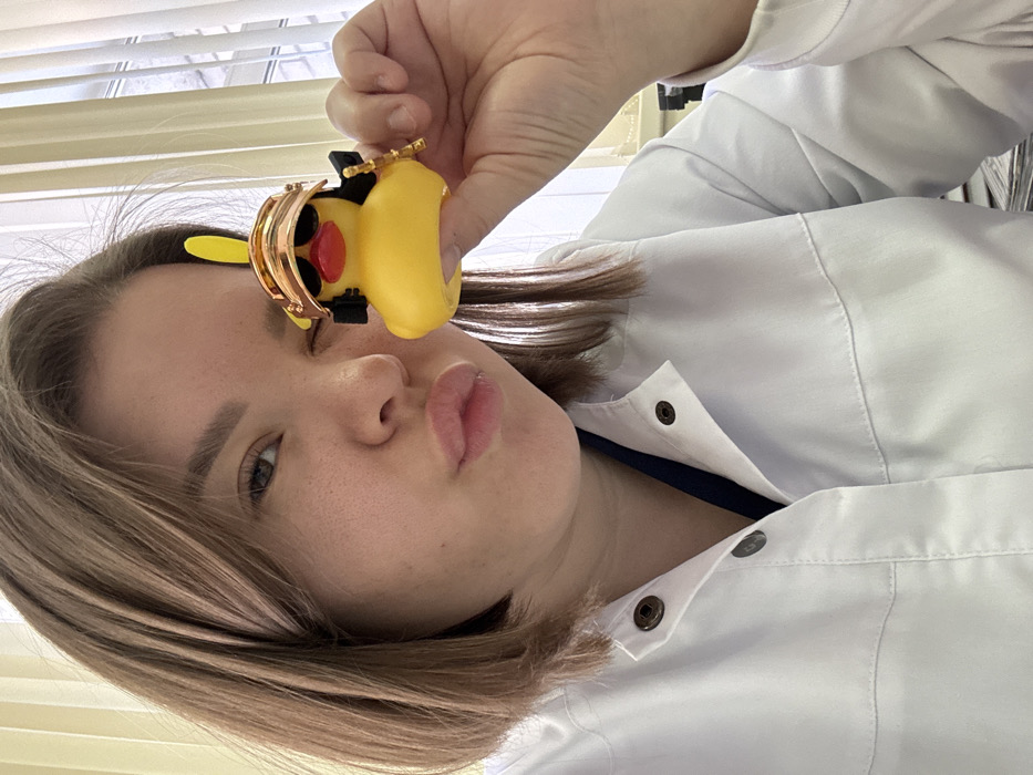 A female individual, appearing to be in her 20s to 30s with short, light brown hair and a fair complexion, is depicted in a close-up, eye-level indoor shot within the city of Kazan, Russia. She is wearing a white lab coat with dark snap buttons over a dark blue undergarment. Her left eye is visible and directed towards the camera, while her lips are puckered. With her left hand, she holds a yellow rubber duck accessorized with gold-colored sunglasses, a gold-colored visor with a yellow plume, and a dark, weapon-like accessory on its left side. The duck is positioned near her face. The background consists of light-colored walls and vertical window blinds, with some papers or files visible on a surface in the lower right, consistent with an office or clinical environment.