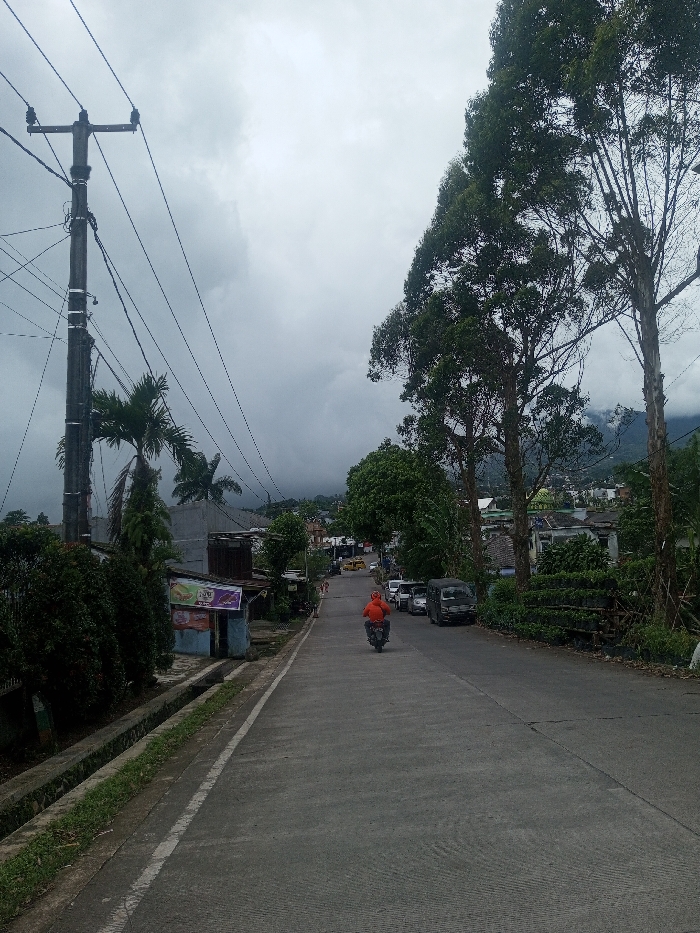 This image captures a wide-angle street view in Sarwahi Mal., India, under an overcast sky. A paved road, appearing to be concrete and lacking a center line, extends uphill from the foreground into the distance. On the left side of the road, a concrete utility pole with multiple overhead electrical wires is prominently positioned. Adjacent to the left edge of the road, a narrow concrete drainage ditch runs parallel, bordered by green grass and dense shrubbery. Further left, several palm trees and other deciduous trees are visible behind a small, light blue building with a reddish roof and advertisement signs. One individual is observed riding a dark-colored motorcycle uphill on the road, positioned slightly to the right of the center, wearing an orange hooded garment. Further up the road on the right, several vehicles are parked, including a dark-colored van or small truck. On the right side of the road, a line of tall, slender trees with dense green foliage stands. In the mid-ground and background, various residential and commercial structures are interspersed among abundant green vegetation. A building with a green dome is partially visible among the structures on the right. Distant mountains, partially obscured by low-hanging grey clouds, form the horizon. The sky is uniformly light grey due to heavy cloud cover.