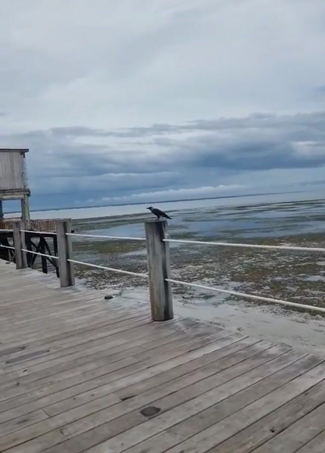 A static shot presents a wooden pier overlooking a shallow body of water under a cloudy sky. A crow perches on a wooden post, part of a railing system composed of posts and rope. The water is shallow, exposing the seabed with patches of vegetation. A small structure is visible on the pier to the left. The camera zooms in on the crow, showing it in greater detail.