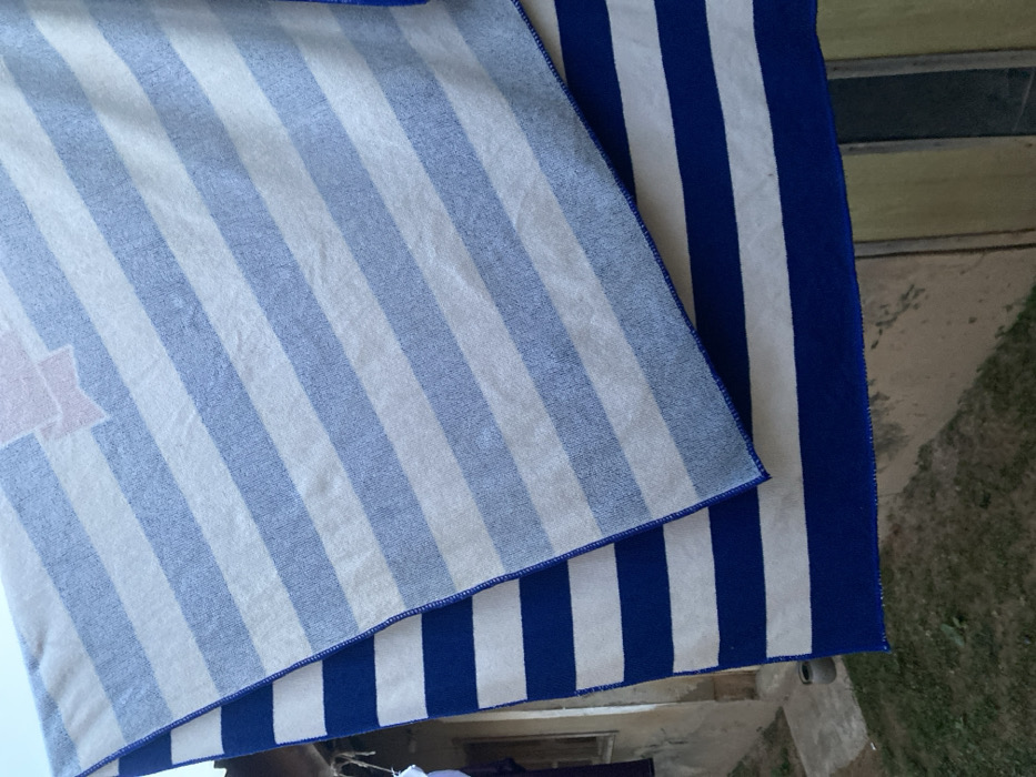 The image displays two striped textiles hanging outdoors, presumably drying, in what appears to be a residential or communal area in Minna, Nigeria. The upper textile, a light blue and white striped blanket or towel, is angled diagonally across the frame from the top-left to the lower-right. A faded, light pink, abstract shape is discernible near the upper-center of this textile. Directly beneath, and parallel to the bottom edge of the frame, is a dark blue and white striped blanket or towel. In the background to the left, a weathered, light-colored building wall, possibly concrete or stucco, is visible. It features a single rectangular window with a dark wooden frame. Below the hanging textiles, the ground consists of sparse green vegetation interspersed with patches of bare earth. A section of a second building or structure, exhibiting a lighter, reflective surface, is partially visible in the lower-right quadrant of the frame. No individuals are present in the scene.